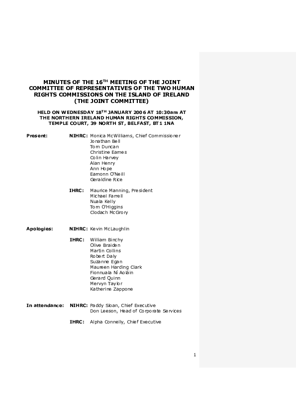 Minutes of the 16th Joint Commission Meeting held 18th January 2006