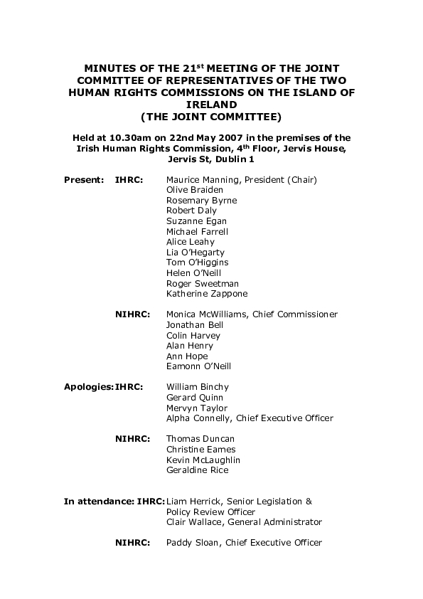 Minutes of the 21st Joint Commission Meeting held 22nd May 2007