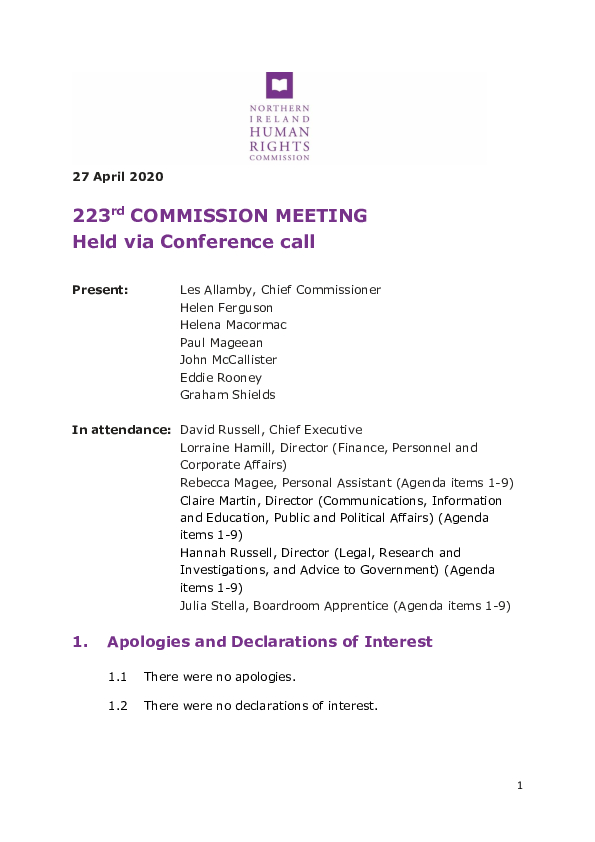 The Northern Ireland Human Rights Commission held its 223rd Commission Meeting on 27 April 2020.