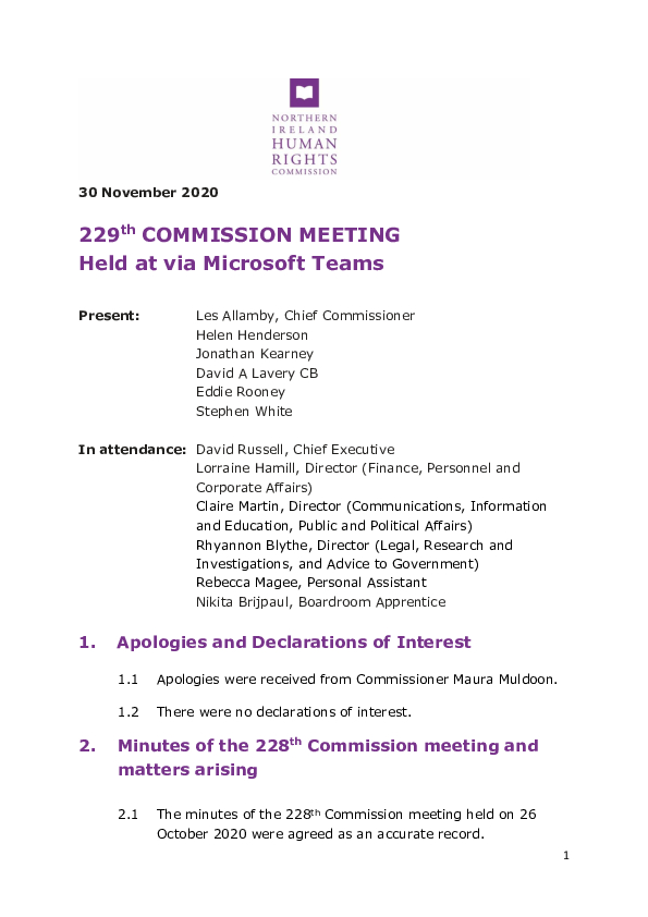 The Northern Ireland Human Rights Commission held its 229th Commission Meeting on 30th November 2020.