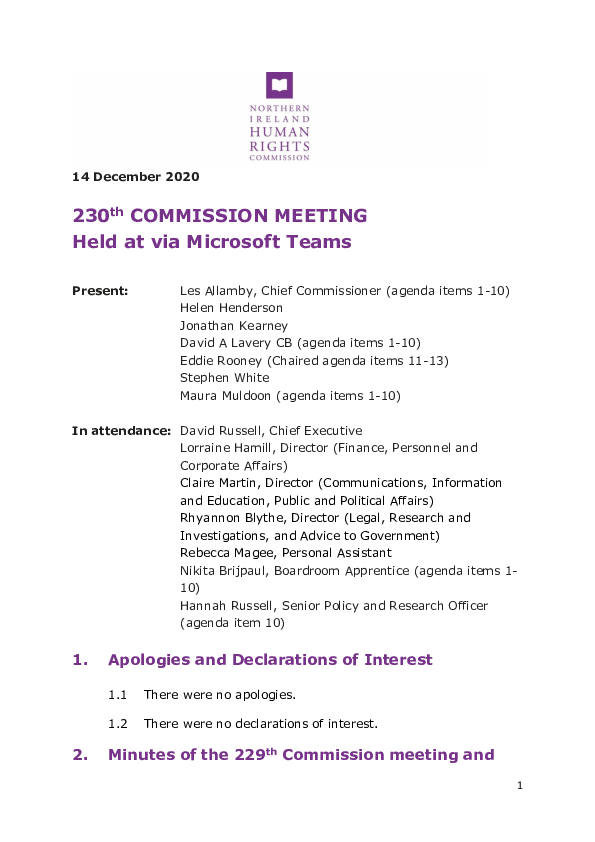 The Northern Ireland Human Rights Commission held its 230th Commission Meeting on 14 December 2020.