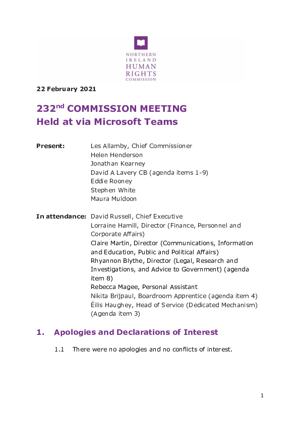 The Northern Ireland Human Rights Commission held its 232nd Commission Meeting on 22 February 2021.