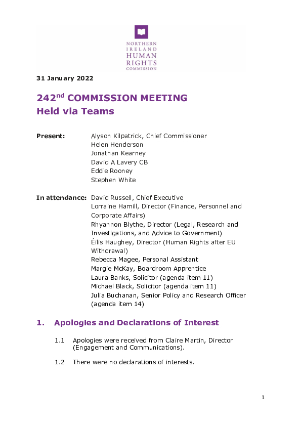 The Northern Ireland Human Rights Commission held its 242nd Commission Meeting on 31 January 2022.