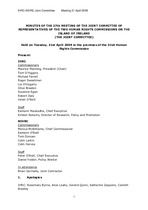 Minutes of the 27th Joint Commission Meeting held 21st April 2009