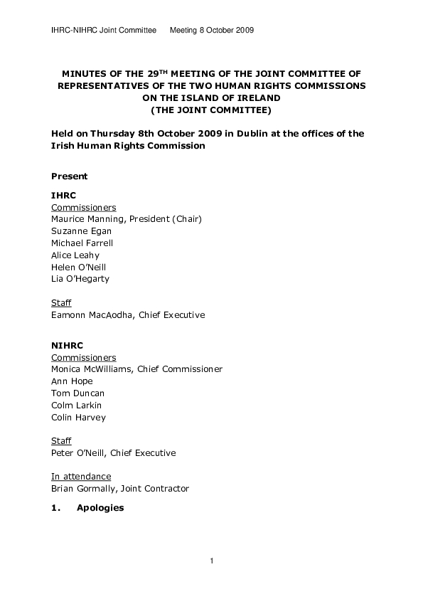 Minutes of the 29th Joint Commission Meeting held 8th October 2009