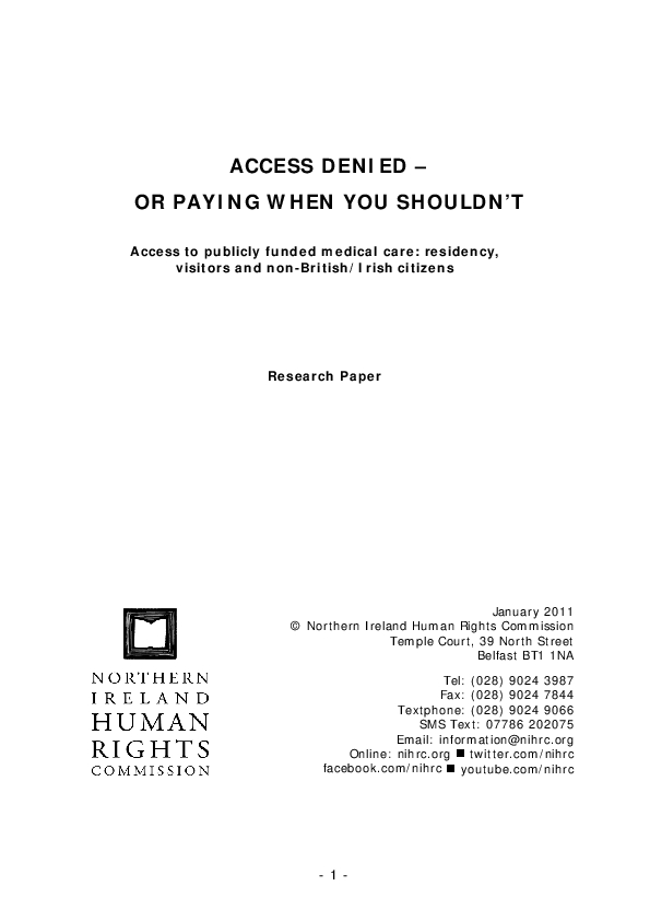 This paper deals with human rights compliance and the current circumstances of access to publicly funded medical care based on residency status in Northern Ireland. It will examine if migrants (or perceived migrants) and visitors are being denied access, treated as private patients, or otherwise charged for medical services when this should not be the case.