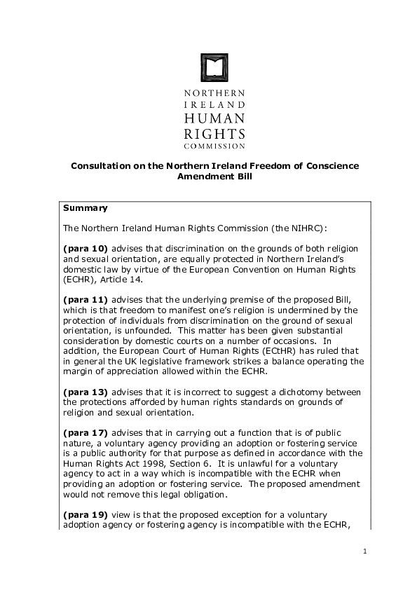 This document contains the Commissions contribution to the consultation on the Northern Ireland Freedom of Conscience Amendment Bill.