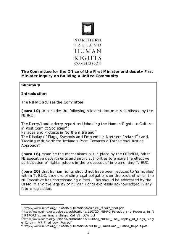The Northern Ireland Human Rights Commission (NIHRC) pursuant to Section 69 (1) of the Northern Ireland Act 1998, reviews the adequacy and effectiveness of law and practice relating to the protection of Human Rights. In accordance with this function the following statutory advice is submitted to Committee for the Office of the First Minister and deputy First Minister (OFMDFM) on its inquiry into ‘Building a United Community.’