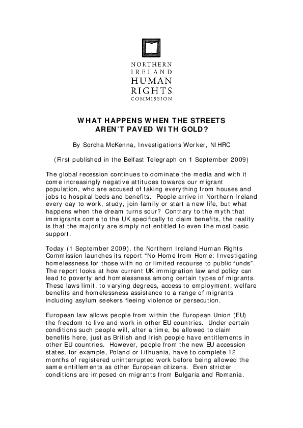 The global recession continues to dominate the media and with it come increasingly negative attitudes towards our migrant population, who are accused of taking everything from houses and jobs to hospital beds and benefits. People arrive in Northern Ireland every day to work, study, join family or start a new life, but what happens when the dream turns sour? Contrary to the myth that immigrants come to the UK specifically to claim benefits, the reality is that the majority are simply not entitled to even the most basic support.