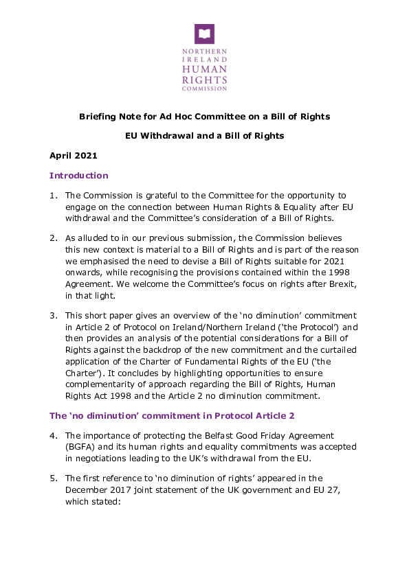 This short paper for the Ad Hoc Committee on a Bill of Rights gives an overview of the ‘no diminution’ commitment in Article 2 of Protocol on Ireland/Northern Ireland (‘the Protocol’) and then provides an analysis of the potential considerations for a Bill of Rights against the backdrop of the new commitment and the curtailed application of the Charter of Fundamental Rights of the EU (‘the Charter’). It concludes by highlighting opportunities to ensure complementarity of approach regarding the Bill of Rights, Human Rights Act 1998 and the Article 2 no diminution commitment.