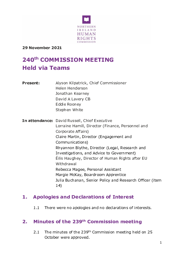 The Northern Ireland Human Rights Commission held its 240th Commission Meeting on 29 November 2021.