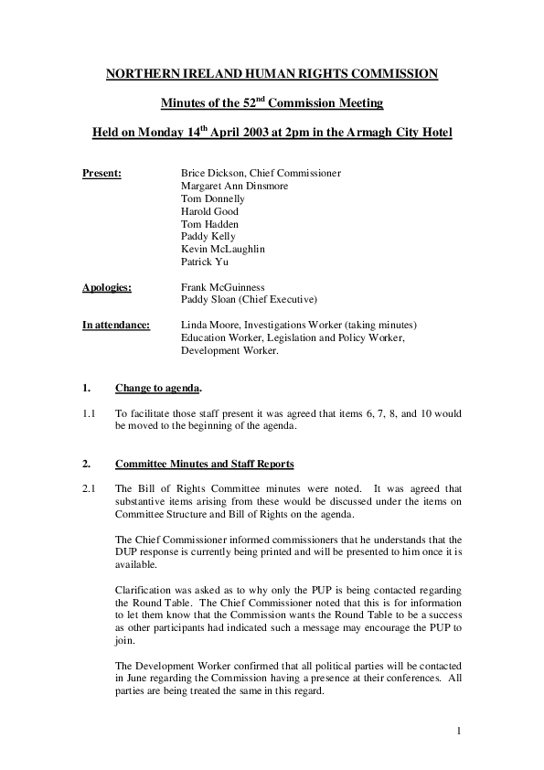 Minutes of the 52nd Commission Meeting, held on 14 April 2003.