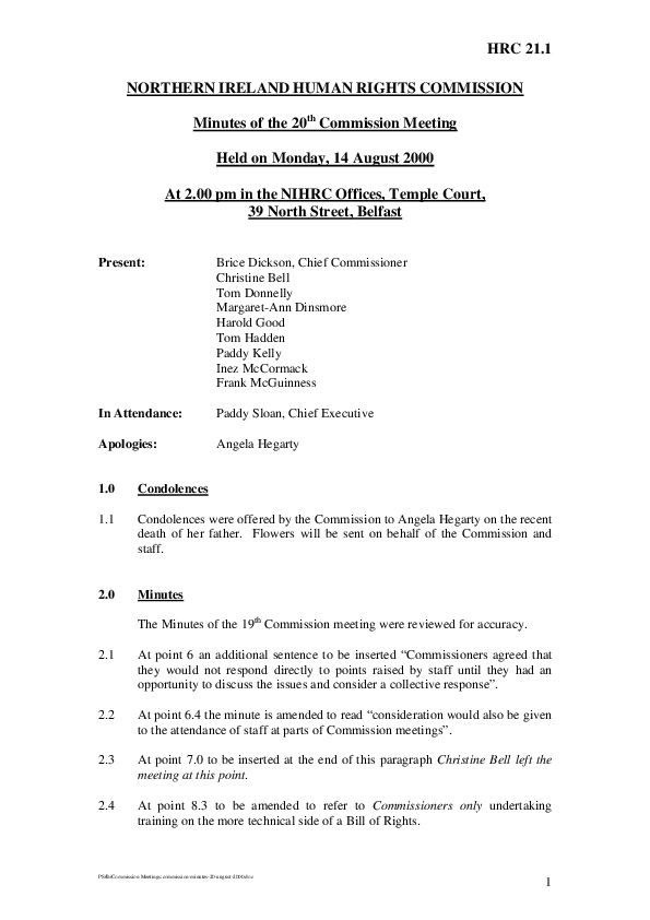 Minutes of the 20th Commission Meeting, held on 14 August 2000.