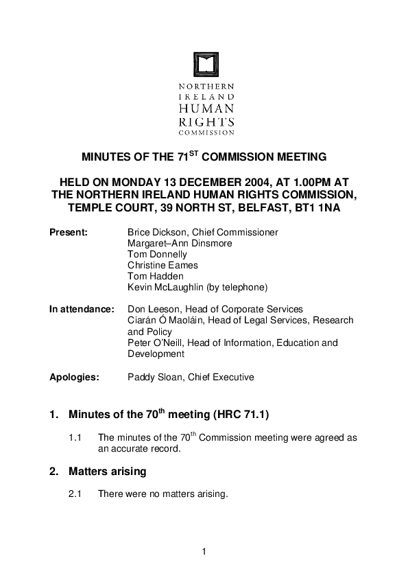 Minutes of the 71st Commission Meeting, held on 13th December 2004.