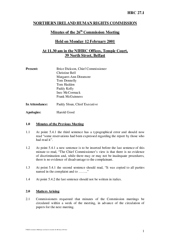 Minutes of the 26th Commission Meeting, held on 12 February 2001.