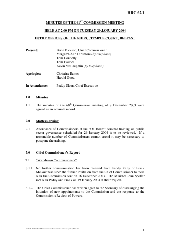 Minutes of the 61st Commission Meeting, held on 20 January 2004.