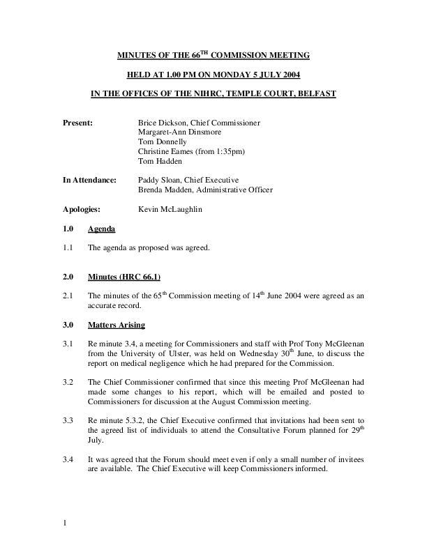 Minutes of the 66th Commission Meeting, held on 5th July 2004.