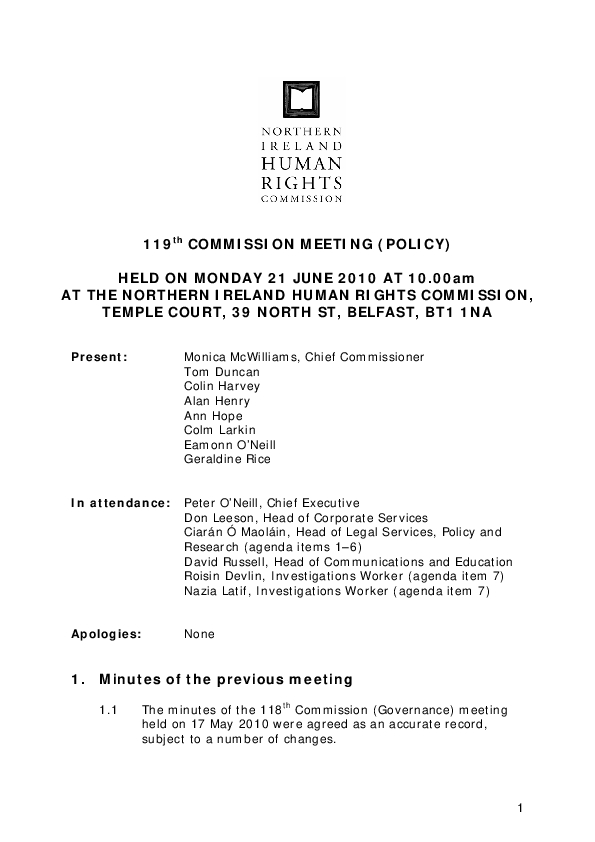 Minutes of the 119th Commission Meeting, held on 21 June 2010.