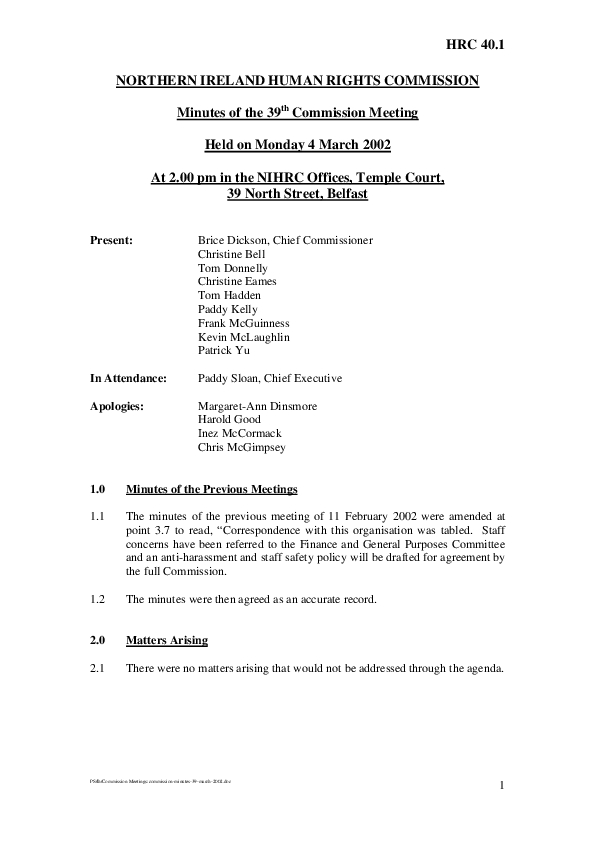 Minutes of the 39th Commission Meeting, held on 4 March 2002.