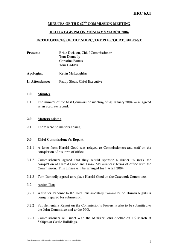 Minutes of the 62nd Commission Meeting, held on 8 March 2004.