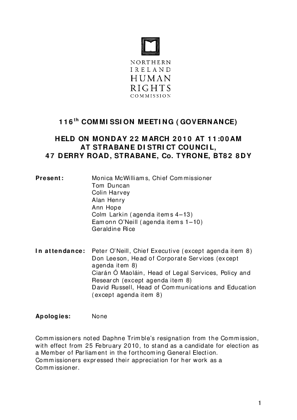 Minutes of the 116th Commission Meeting, held on 22 March 2010.