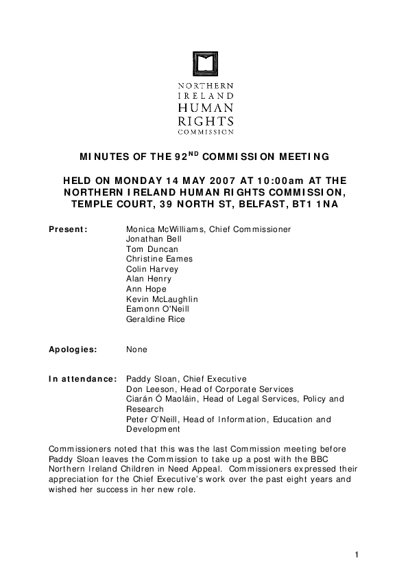 Minutes of the 92nd Commission Meeting, held on 14 May 2007.