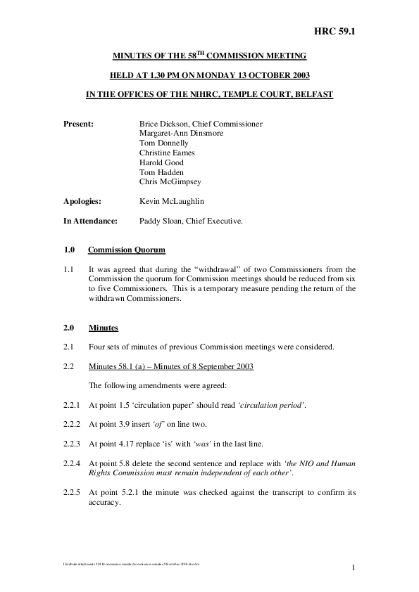 Minutes of the 58th Commission Meeting, held on 13 October 2003.