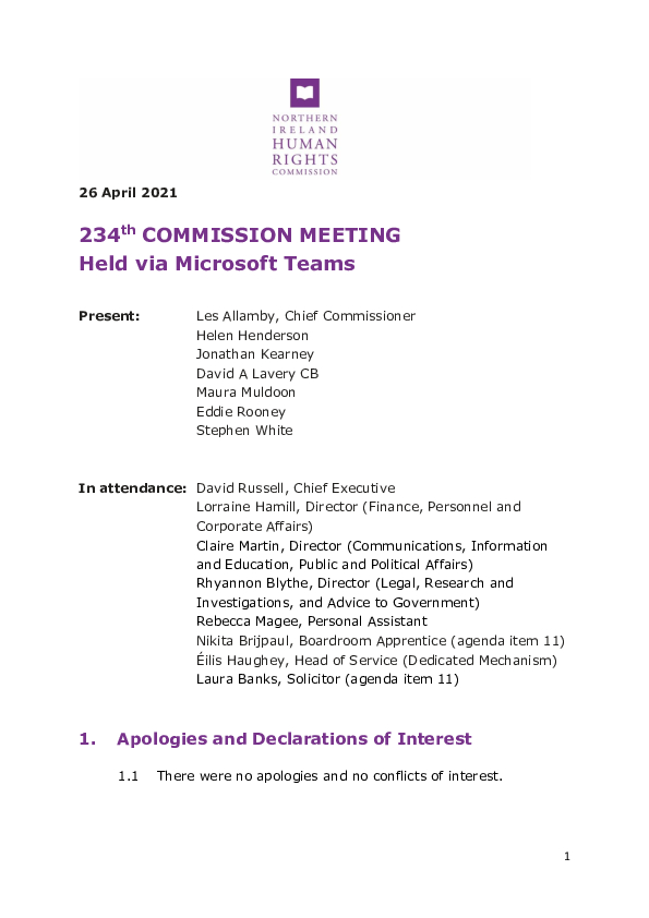 The Northern Ireland Human Rights Commission held its 234th Commission Meeting on 26 April 2021.