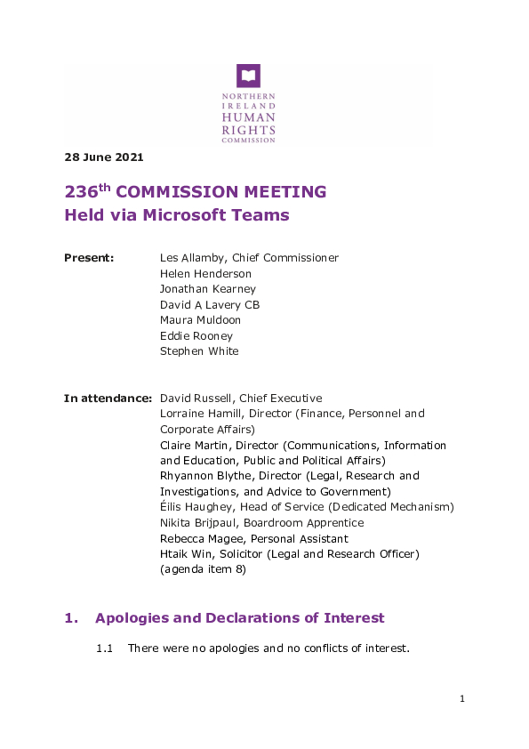 The Northern Ireland Human Rights Commission held its 236th Commission Meeting on 28 June 2021.