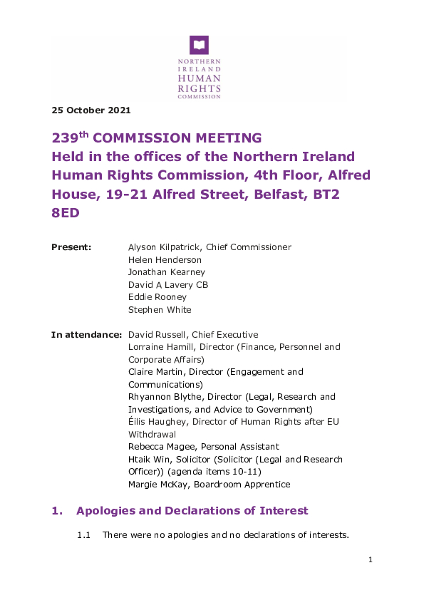 The Northern Ireland Human Rights Commission held its 239th Commission Meeting on 25 October 2021.