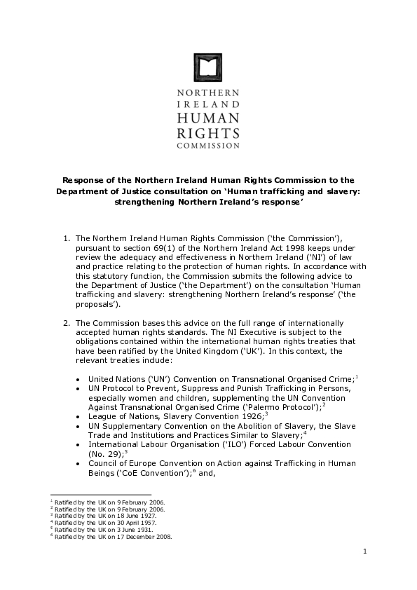 Response of the Northern Ireland Human Rights Commission to the Department of Justice consultation on ‘Human trafficking and slavery: strengthening Northern Ireland’s response’