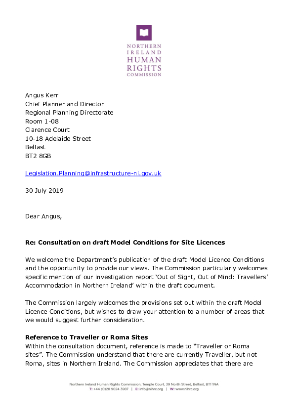 Northern Ireland Human Rights Commission response to the Department for Infrastructure consultation on the draft Model Conditions for Site Licences.