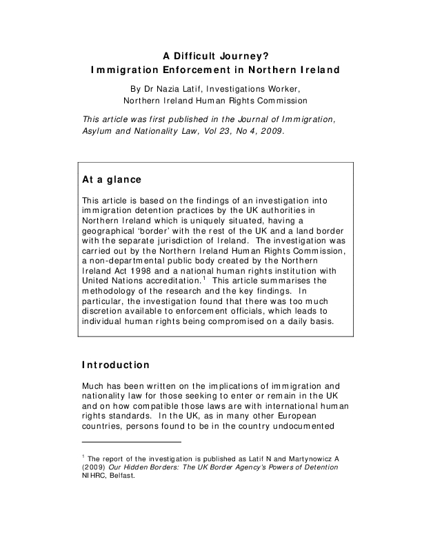 This article is based on the findings of an investigation into immigration detention practices by the UK authorities in Northern Ireland which is uniquely situated, having a geographical ‘border’ with the rest of the UK and a land border with the separate jurisdiction of Ireland.