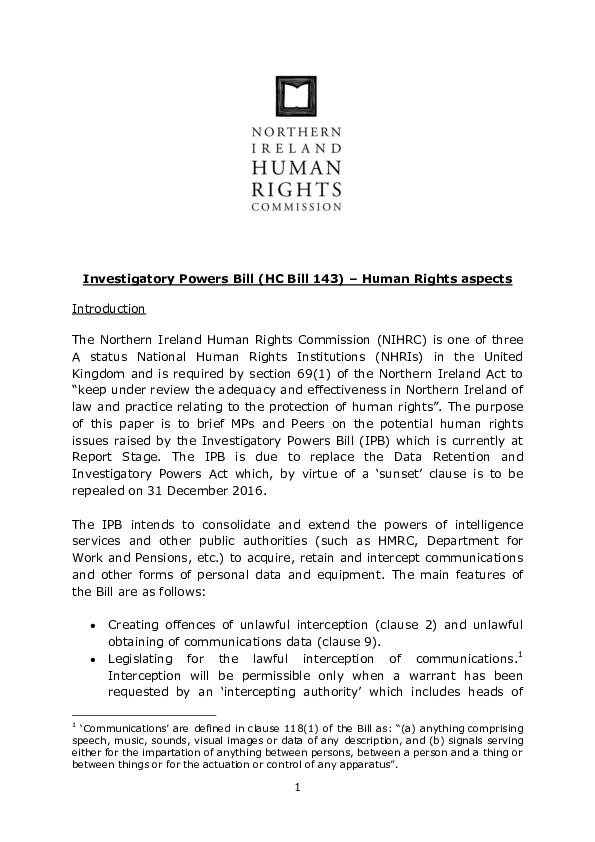 The Northern Ireland Human Rights Commission (NIHRC) is one of three A status National Human Rights Institutions (NHRIs) in the United Kingdom and is required by section 69(1) of the Northern Ireland Act to “keep under review the adequacy and effectiveness in Northern Ireland of law and practice relating to the protection of human rights”. The purpose of this paper is to brief MPs and Peers on the potential human rights issues raised by the Investigatory Powers Bill (IPB) which is currently at Report Stage. The IPB is due to replace the Data Retention and Investigatory Powers Act which, by virtue of a ‘sunset’ clause is to be repealed on 31 December 2016.