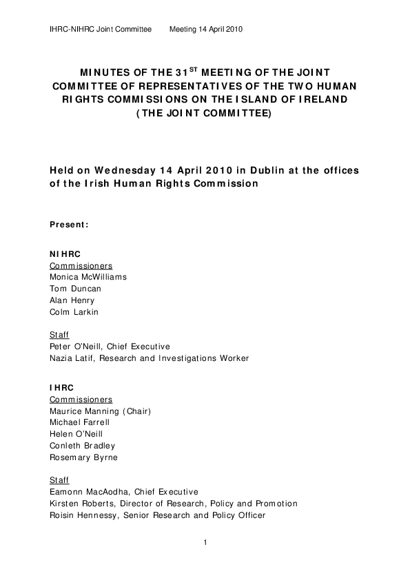 Minutes of the 31st Meeting of the Northern Ireland Human Rights Commission and the Irish Human Rights Commission, held on 14 April 2010.