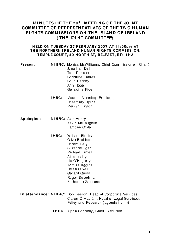 Minutes of the 20th Meeting of the Northern Ireland Human Rights Commission and the Irish Human Rights Commission, held on 27 February 2007.