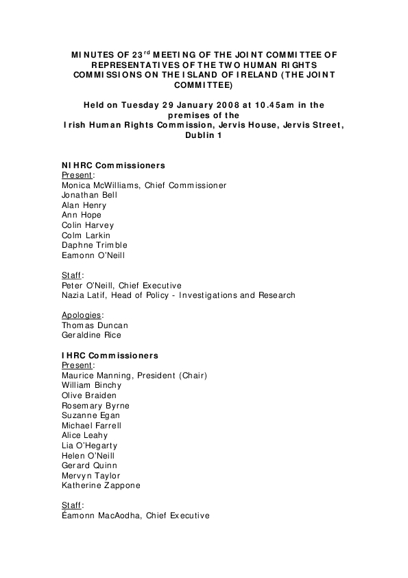 Minutes of the 23rd Meeting of the Northern Ireland Human Rights Commission and the Irish Human Rights Commission, held on 29 January 2008.