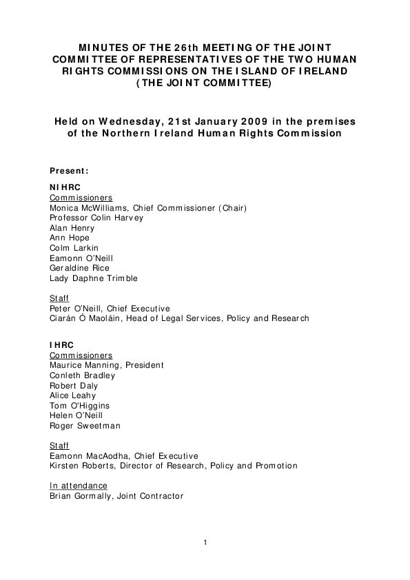 Minutes of the 26th Meeting of the Northern Ireland Human Rights Commission and the Irish Human Rights Commission, held on 21 January 2009.