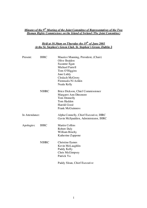 Minutes of the 9th Meeting of the Northern Ireland Human Rights Commission and the Irish Human Rights Commission, held on 19 June 2003.