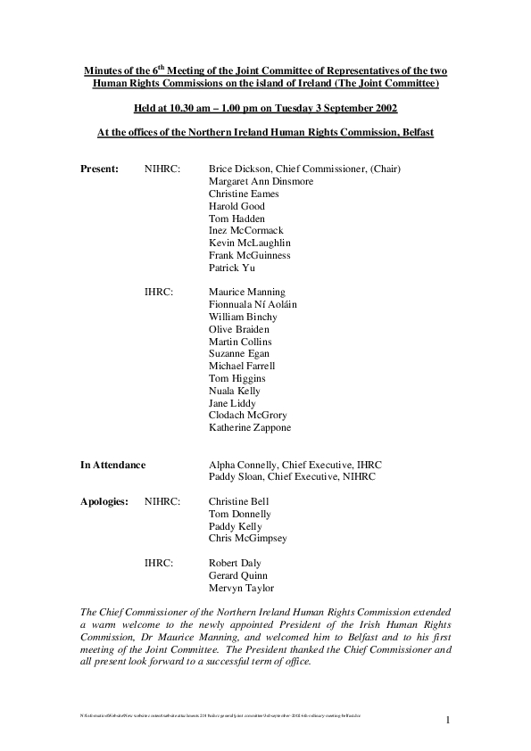 Minutes of the 6th Meeting of the Northern Ireland Human Rights Commission and the Irish Human Rights Commission, held on 3 September 2002.