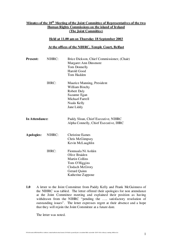 Minutes of the 10th Meeting of the Northern Ireland Human Rights Commission and the Irish Human Rights Commission, held on 18 September 2003.