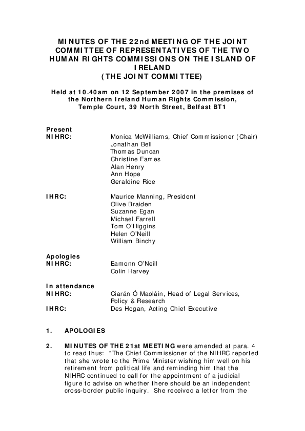 Minutes of the 22nd Meeting of the Northern Ireland Human Rights Commission and the Irish Human Rights Commission, held on 12 September 2007.
