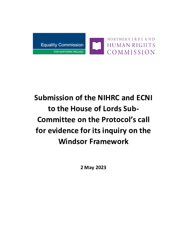 Joint submission: Northern Ireland Human Rights Commission and Equality Commission submission to the Inquiry on Windsor Framework by the House of Lords Sub-Committee on the Protocol.