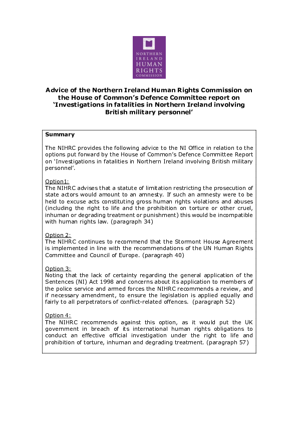 NIHRC advice on HoC Defence Committee report on 'Investigations in fatalities in Northern Ireland involving British military personnel'