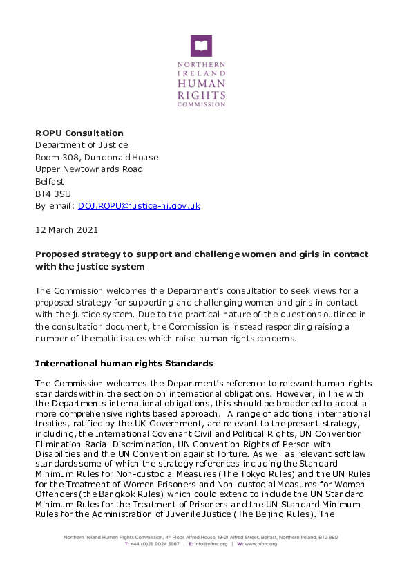 NIHRC reponse to the Department of Justice proposed strategy to support and challenge women and girls in contact with the justice system