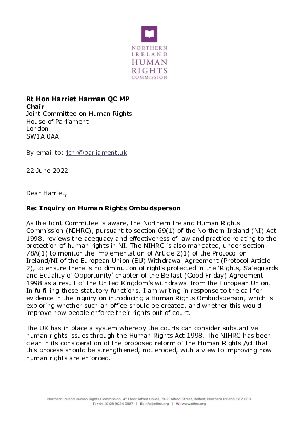 NIHRC Letter to the Joint Committee on Human Rights regarding an Inquiry on Human Rights Ombudsperson