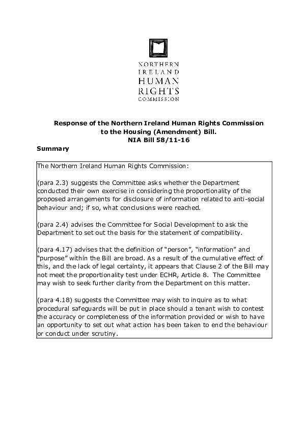 The Northern Ireland Human Rights Commission (NIHRC) pursuant to Section 69 (4) of the Northern Ireland Act 1998, is obliged to advise the Assembly whether a Bill is compatible with human rights. Accordingly, the following statutory advice is submitted to the Northern Ireland Assembly Committee for Social Development in relation to the Housing Amendment Bill (hereinafter the “Bill”).