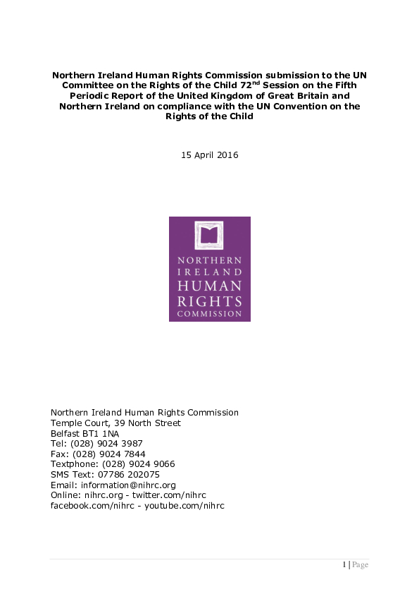 As part of the NIHRC’s engagement with the United Nations and Council of Europe treaty monitoring processes, it presents this submission regarding the UK’s Fifth Periodic Report on compliance with the UN Convention on the Rights of the Child (UN CRC) to the UN Committee on the Rights of the Child (the Committee). The Commission submitted to the Committee during the Committee’s 72nd session and has developed this submission in line with the List of Issues, taking into account the reply of the State Party.