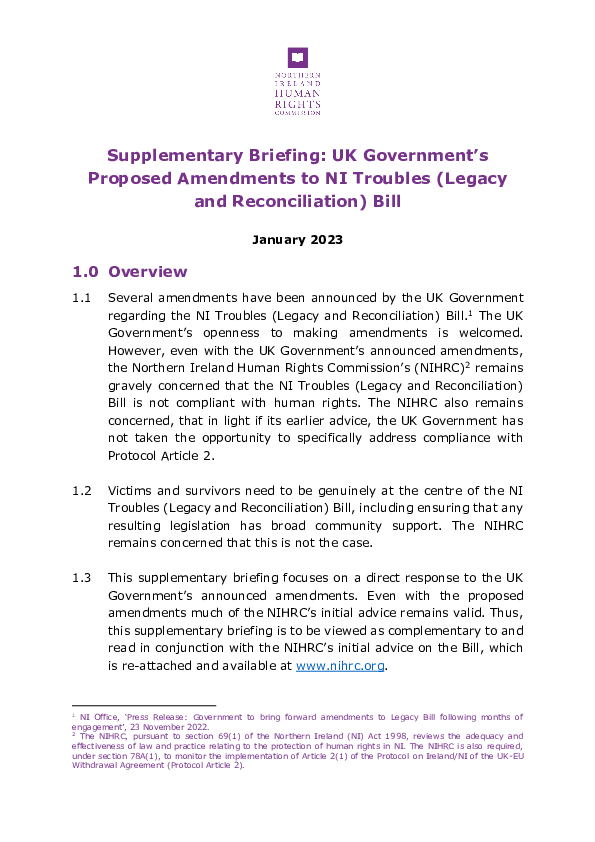NIHRC Supplementary Briefing: UK Government’s Proposed Amendments to NI Troubles (Legacy and Reconciliation) Bill