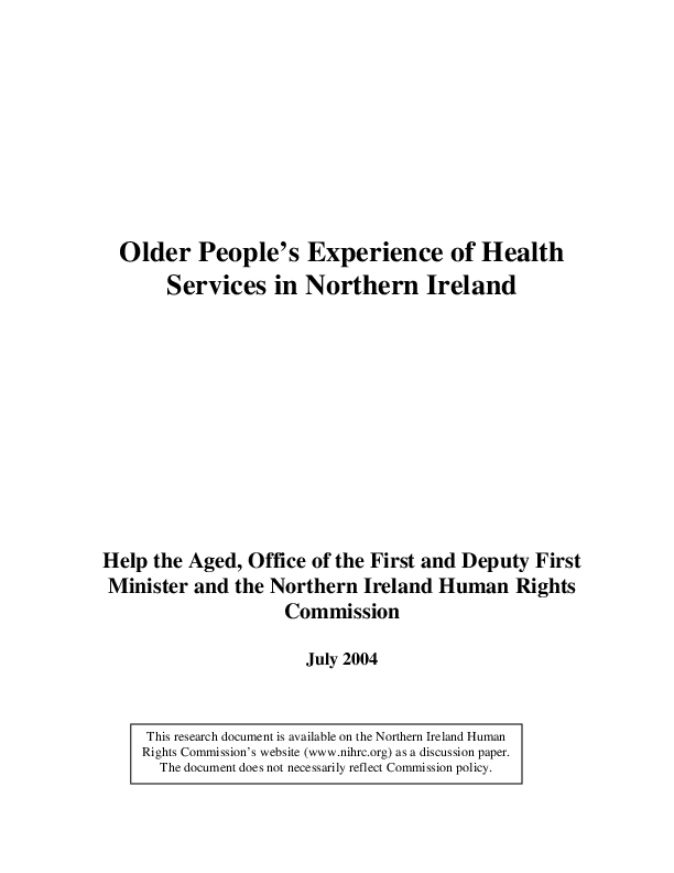 This study was commissioned by Help the Aged, Office of the First and Deputy First Minister in partnership with the Northern Ireland Human Rights Commission to explore older people’s experience of health services specifically having regard to protection and promotion of their human rights. Age discrimination can be direct, occurring when a person is treated less favourably than others because of their age. Indirect discrimination occurs when older people are disadvantaged because they are disproportionately affected in comparison to the rest of the population.